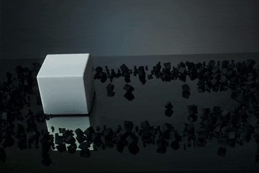 The Simulation run real-time using the Unity3D engine. Black crystals are scattered on the mirrored surface beforehand. The block pushes them and a slight drag keeps some of the crystals permanently in play, never repeating. Almost like sand washed on the shore.