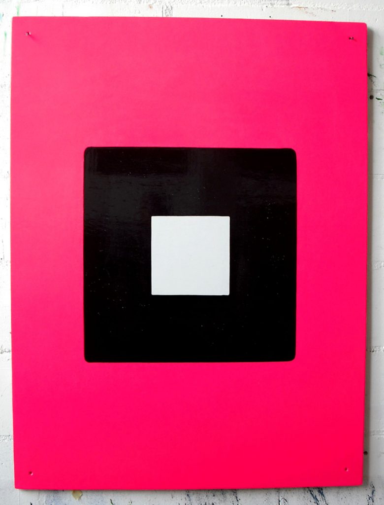 Some panels are individual works, others are grouped to create a larger entity. One aspect of the group works is the physical re-arrangement of individual painted panels – shifted around, rotated, linked, spaced apart. There is a tension between the ‘sovereignty’ of individual panels and the dialogue of these parts within the arrangement. The work follows on from paintings on plywood using signpainters’ enamel, and multi-screen digital animations.
