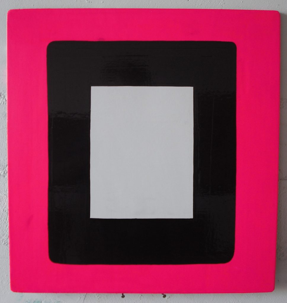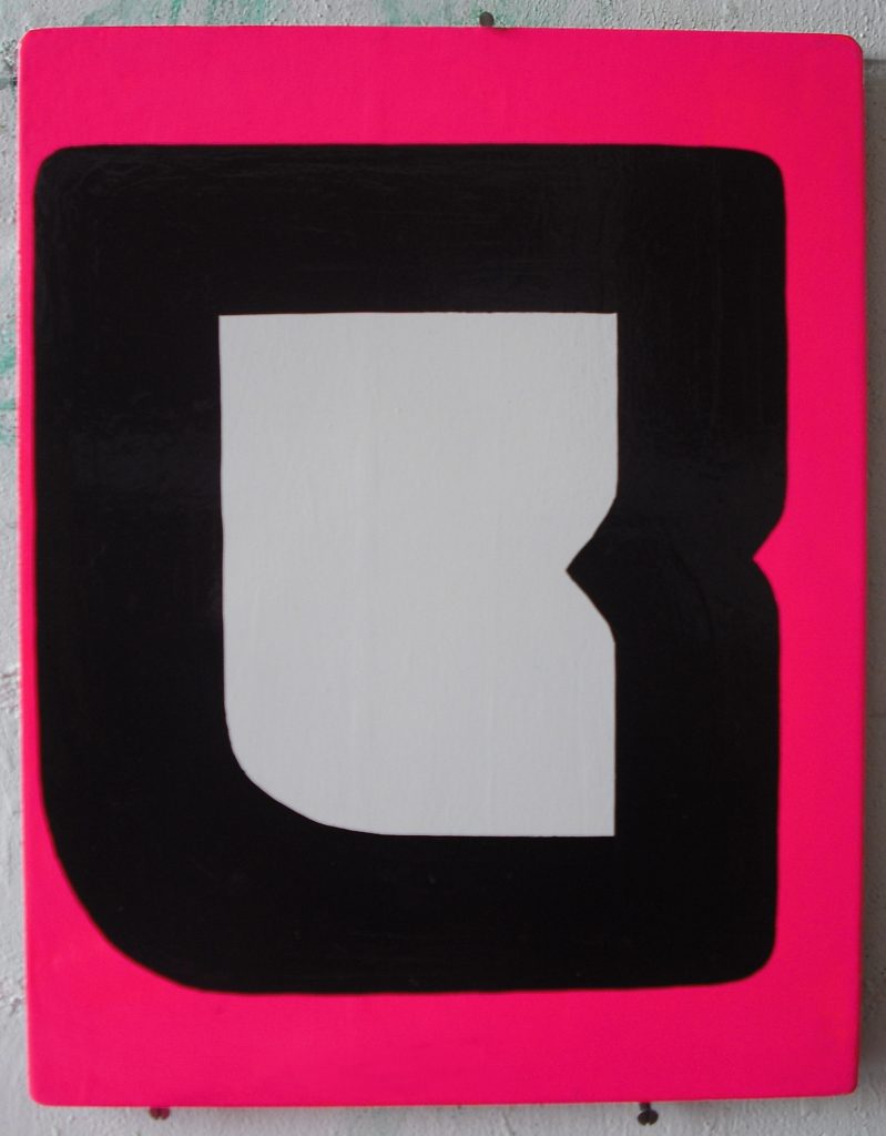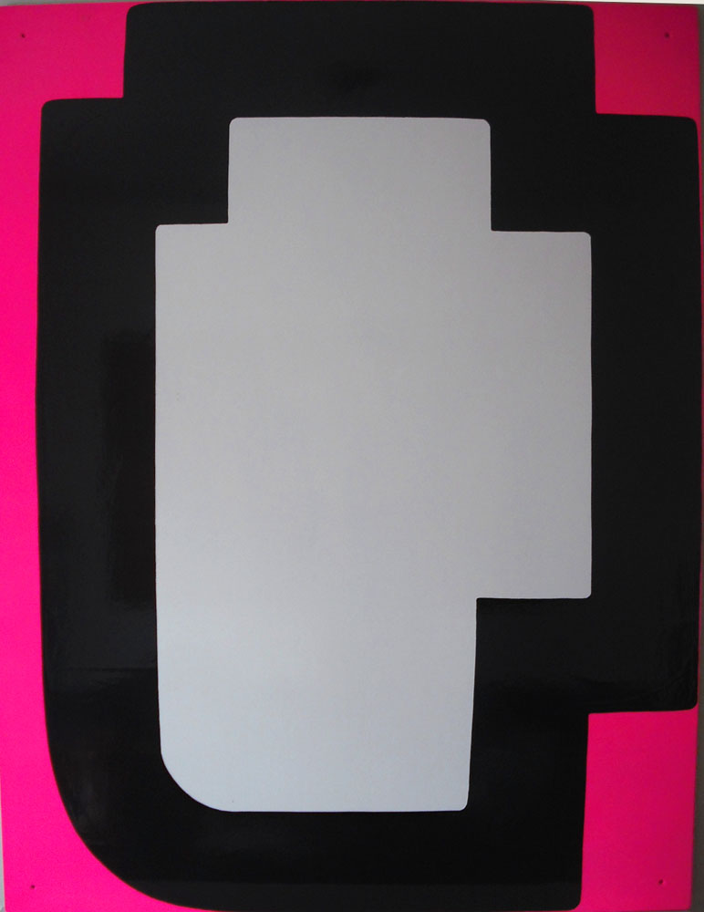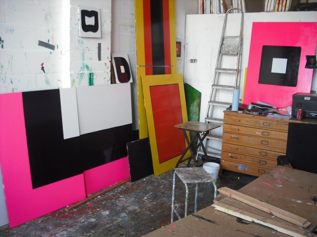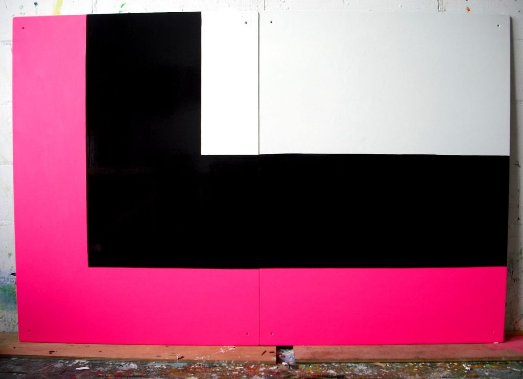 Some panels are individual works, others are grouped to create a larger entity. One aspect of the group works is the physical re-arrangement of individual painted panels – shifted around, rotated, linked, spaced apart. There is a tension between the ‘sovereignty’ of individual panels and the dialogue of these parts within the arrangement. The work follows on from paintings on plywood using signpainters’ enamel, and multi-screen digital animations.